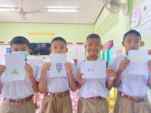 นักเรียนนำรูปทรงเลขาคณิตที่เห็นมาสร้างเป็นภาพที่มีความหมาย ที่เชื่อมโยงกับตัวเองและร่วมกันถ่ายทอดเรื่องราว