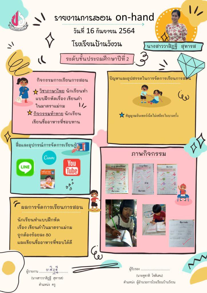 รายงานการจัดการเรียนการสอน ชั้นประถมศึกษาปีที่ 2 วันพฤหัสบดีที่ 16 กันยายน 2564 กันยายน 16, 2021 โรงเรียนบ้านวังวน การจัดการเรียนการสอนในสถานการณ์โควิด เช้าวิชาภาษาไทยนักเรียนทำแบบฝึกหัดเขียนคำมาตราแม่กม บ่ายกิจกรรมท้าทายเขียนอาหารที่ชอบทาน